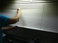 ブラインドに洗剤液をなじませる作業は、片方の手でブラインドを軽く引くようにしすると楽です。すでにブラインドは手前に倒してあるので、手前に引きながら拭くことで作業が楽になりました。