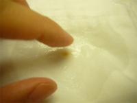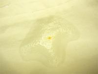 この時のコツは染み(シミ)部分を湿らせ続ける事。私は洗剤液を吸わせたティッシュを染み(シミ)にあててビニール袋に入れていました(旅先だったため)。